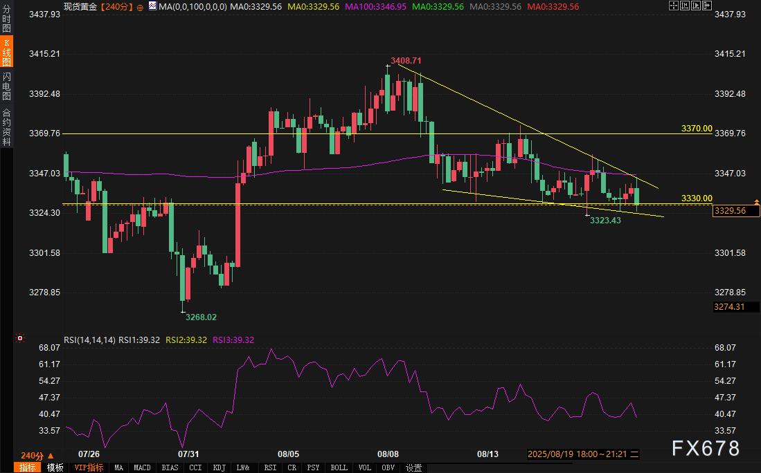 周二(8月19日)北京时间晚间,现货黄金(XAU/USD)在3340美元附近维持窄幅震荡,市场情绪在美联储政策预期与俄乌局势的不确定性之间摇摆不定。金价周一在白宫特朗普-泽连斯基会晤后小幅回落,但周二企稳于3342美元附近,显示出避险需求的韧性。美元指数(DXY)从周一的四日高点98.32回落至98.00附近,美国10年期国债收益率从周一的4.35%高位小幅下行至4.326%,为金价提供温和支撑。与此同时,市场对即将召开的杰克逊霍尔年会(8月21-23日)高度关注,美联储的最新政策信号可能成为金价走势的关键催化剂。俄乌局势的持续紧张以及特朗普的关税言论进一步加剧了市场的不确定性,推动金价在高位区间内保持谨慎盘整。