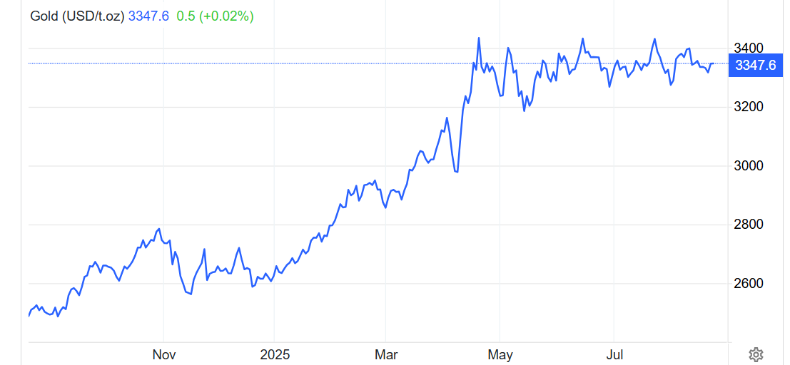 8月到期的近月COMEX黄金期货价格在周三收涨超过1%,至3343.40美元/盎司,一举创下一周以来的收盘新高,盘中黄金期货与现货价格一度涨超3350美元/盎司关口;近月8月COMEX白银期货价格也跟随黄金价格上涨,周三收涨+1.2%,至37.705美元/盎司。