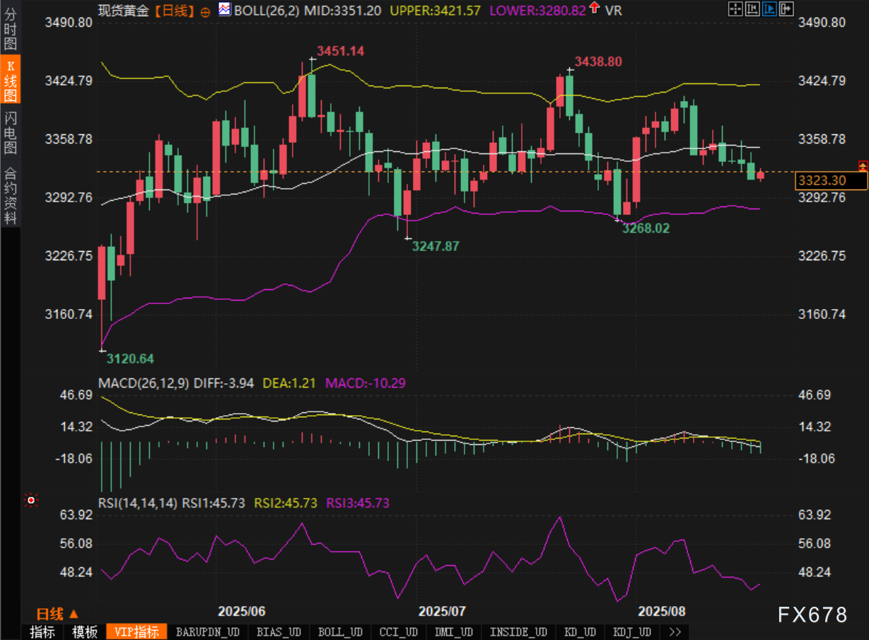 日线图显示,布林带中轨位于3351.20,上轨3421.57,下轨3280.82,带宽阶段性收敛,价格运行在中轨下方、靠近下半区间,短线仍属“中性偏弱”的均值回归结构。当前K线实体不大,前期数根小阳小阴交错,影线频繁,显示资金在关键均衡位附近博弈。