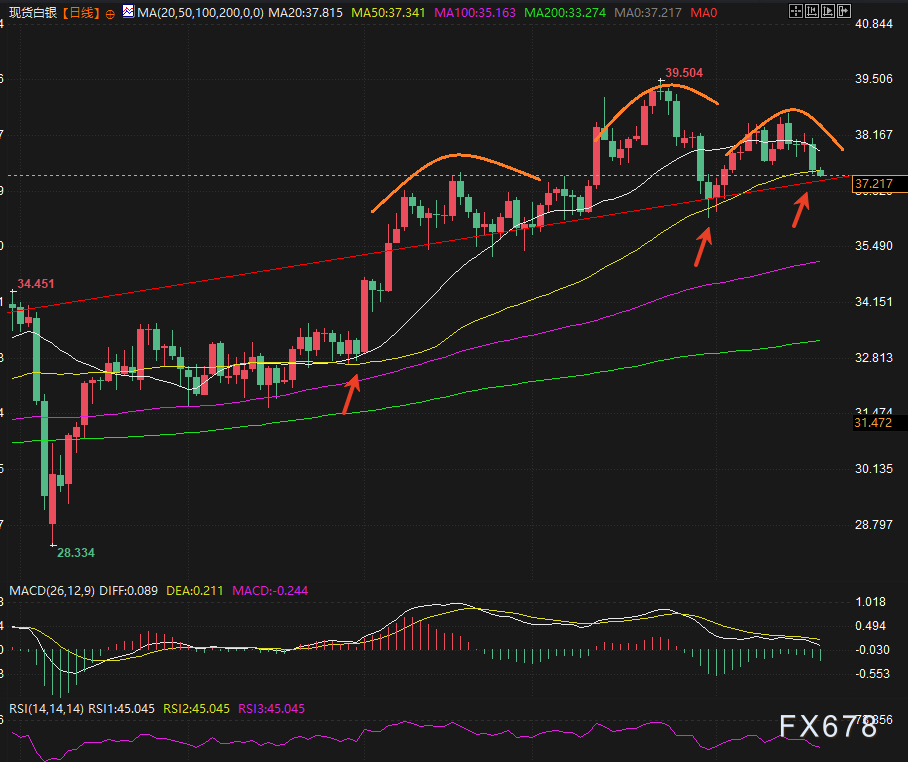 白银价格目前正处于关键的50日移动平均线位置以及大型头肩顶颈线位置,此前两次测试50日均线,银价受均线支撑成为交易员启动看涨行情的跳板。