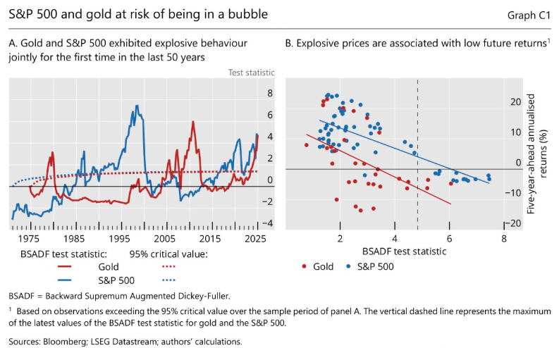 国际清算银行称,泡沫的特征是价格快速且加速上涨——类似于爆炸性行为——随后出现剧烈回调。“过去几个季度是至少50年来首次出现黄金与股票同时进入这种爆炸性区域的情况……泡沫在爆发阶段之后,通常会伴随着急剧而迅速的修正而破灭。”