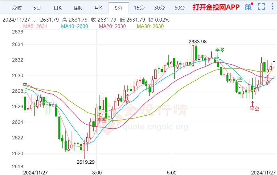 周三(11月27日)本交易日现货黄金日内维持震荡走势,今日开盘报2632.24美元/盎司,最高触及2633.98美元/盎司,最低触及2626.98美元/盎司,截止发稿金价报2630.30美元/盎司,跌幅0.10%。