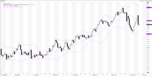 从日线图看,国际黄金测试2706美元/盎司阻力位失败,布林带价格触碰中线后被压制向下,短期面临较大的回调压力。