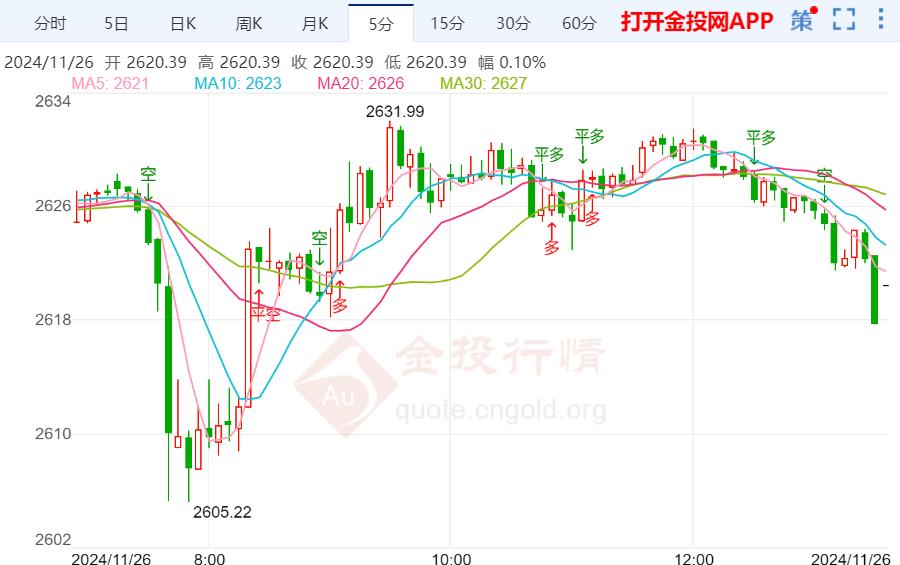 周二(11月26日)亚市盘中,现货黄金在昨日暴跌后继续承压,金价目前位于2624.79美元/盎司附近。本交易日,投资者将聚焦美联储会议纪要,预计将引发市场大行情。北京时间周三03:00,美国联邦公开市场委员会(FOMC)将公布11月议息会议的纪要。
