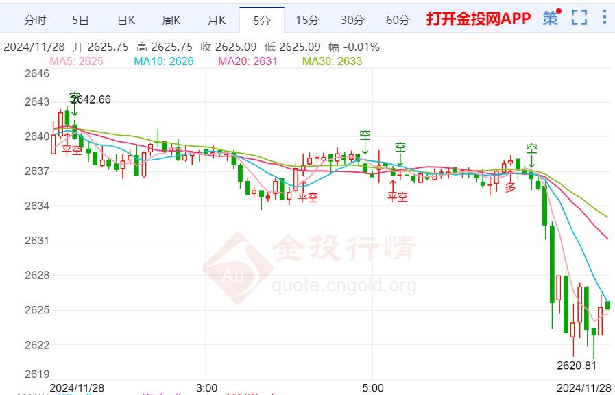 周四(11月28日)本交易日国际金价日内维持震荡走势,今日开盘报2637.16美元/盎司,最高触及2638.84美元/盎司,最低触及2620.81美元/盎司,截止发稿金价报2626.64美元/盎司,跌幅0.34%。周三公布的美国10月个人支出月率录得0.4%,高于市场预期0.3%,前值位0.5%;美国10月核心PCE物价指数月率录得0.3%,符合市场预期,前值为0.3%;美国10月核心PCE物价指数年率录得2.8%,符合市场预期,前值为2.7%;