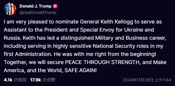 财联社11月28日讯(编辑 赵昊)当地时间周三(11月27日),美国候任总统特朗普在社交媒体上宣布,将提名基思·凯洛格(Keith Kellogg)担任总统助理与“乌克兰和俄罗斯问题特使”。