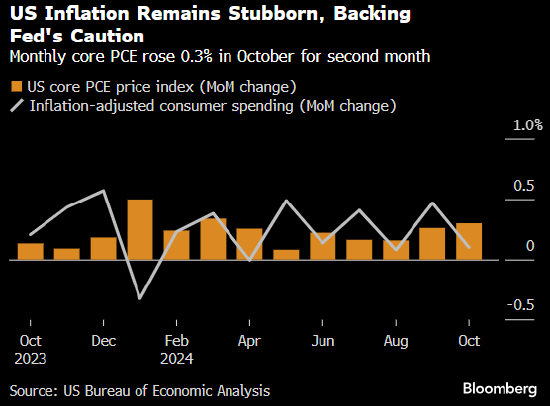 美联储关注的核心通胀指标10月同比加速上升,为决策者在降低利率方面的谨慎心态提供了更多支持。