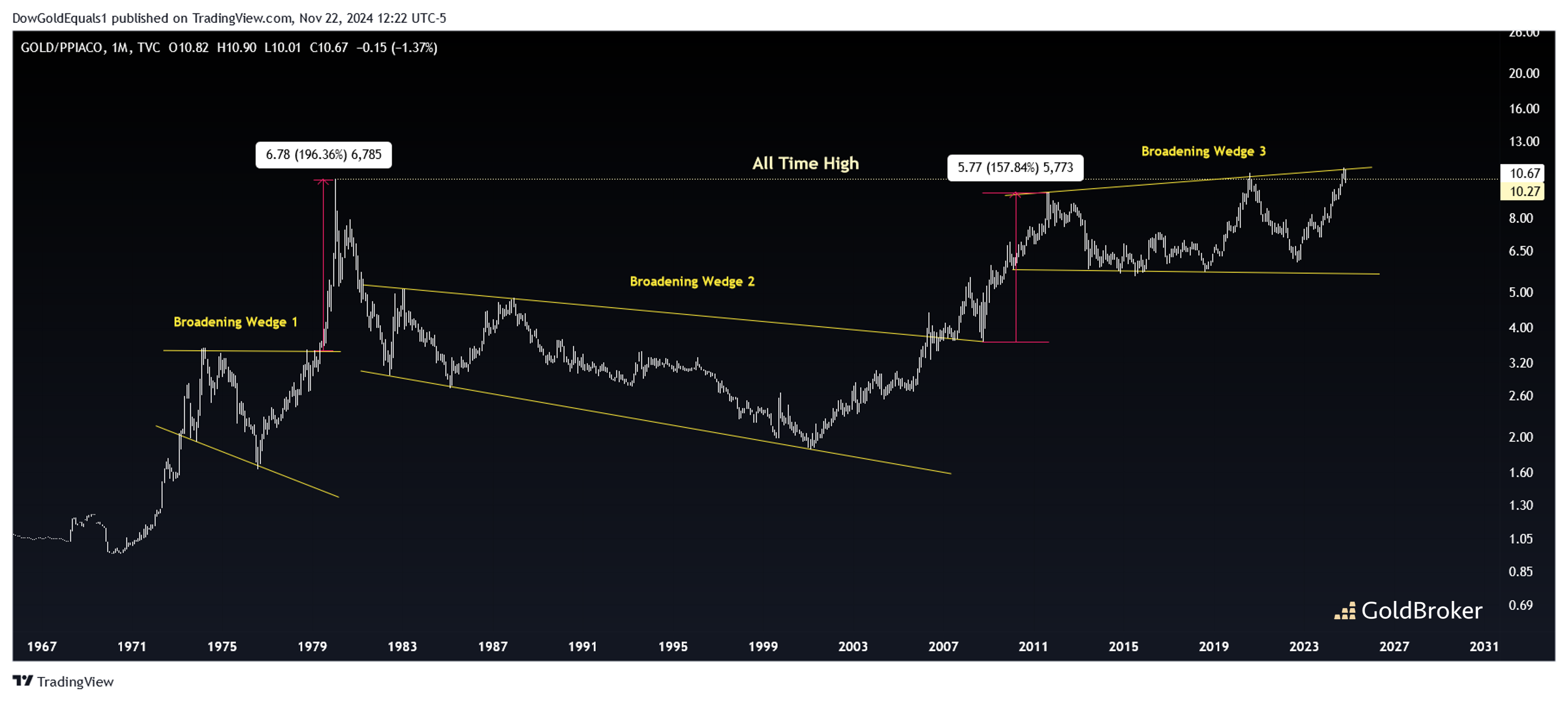 “我本来可以在这里画一个类似的杯柄图,但我想提请你注意其他几点。首先,我们可以看到黄金/PPI在过去几个月刚刚超过其1980年的历史最高点,现在似乎正在回测这一高点-这是一个非常看涨的迹象。”