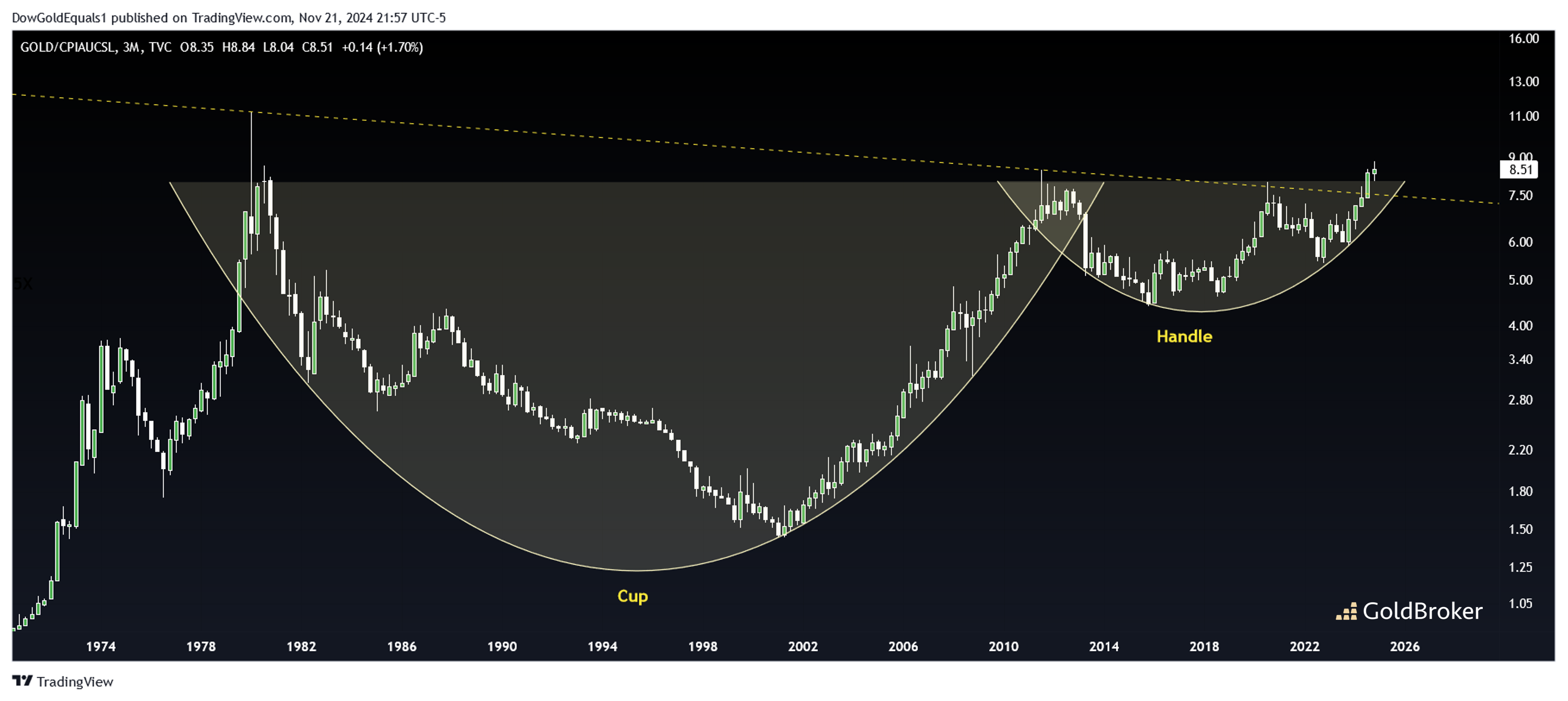 “我们上次查看的是5月份的年度图表,并注意到拐点,我们发现自己处于一个巨大的杯柄形态中。本周,我们将深入研究季度图表,并注意到长期下降阻力线确实似乎正在发生重大突破。”