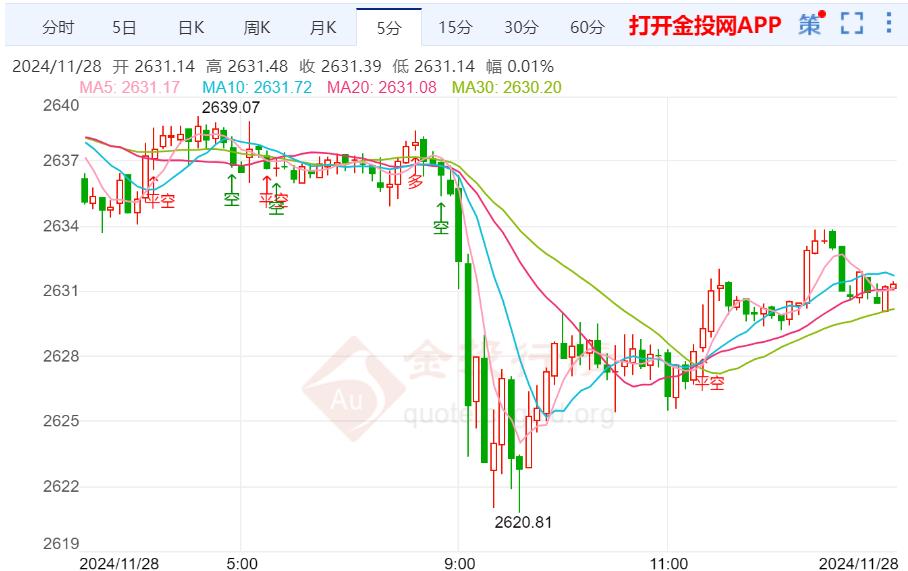 周四(11月28日)本交易日现货黄金日内维持震荡走势,今日开盘报2637.16美元/盎司,最高触及2638.84美元/盎司,最低触及2620.81美元/盎司,截止发稿金价报2631.31美元/盎司,跌幅0.16%。
