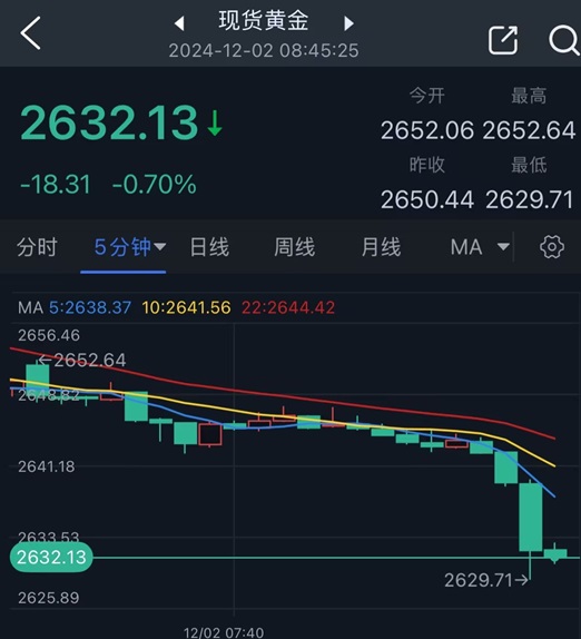 24K99讯 周一(12月2日)亚市早盘,现货黄金短线出现暴跌,金价刚刚一度跌破2630美元/盎司关口,最低跌至2629.71美元/盎司。