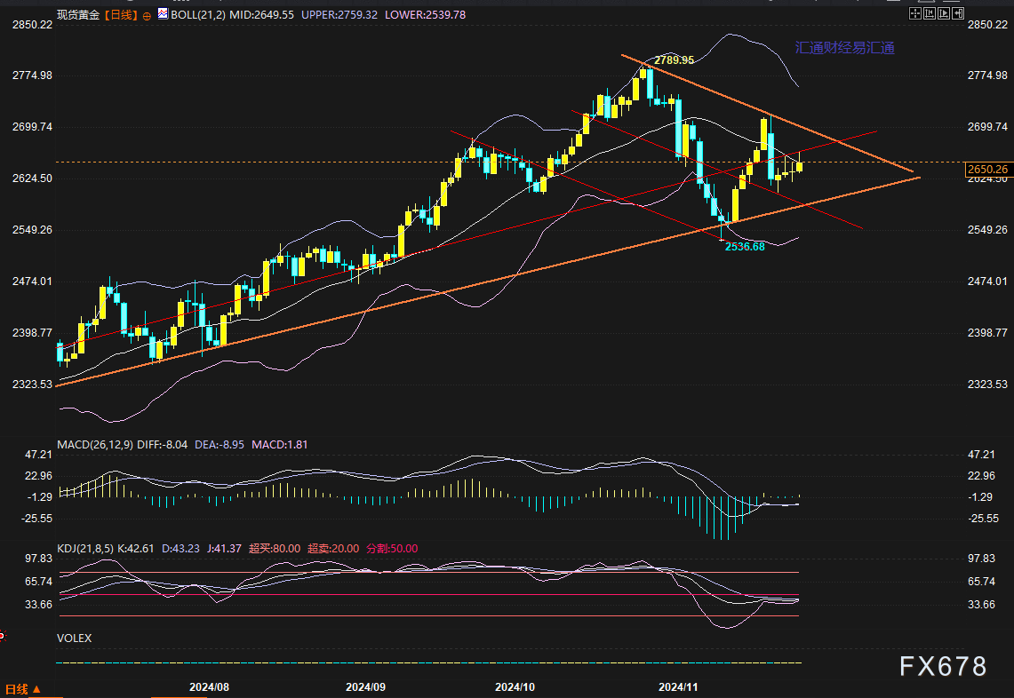除了上述两根橙色线,依据水平线来看支撑阻力价格有哪些?阻力依次关注:2660-2666区间。2684-2688、2694、2700、2708。更上方的2721-2750区域预计卖压巨大。支撑依次关注:2644、2637-2632区间、2620、2605-2600区间、若跌破则需关注2565-2560区间支撑。