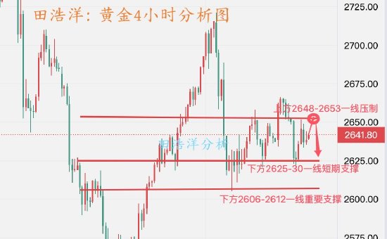 从目前4小时线走势分析来看,上方我们关注2648-2653一线压制,下方我们关注2625-2630一线短期支撑,下方重点关注2606-2612一线支撑,操作上保持顺势参与主基调。具体操作策略我会在盘中提示,及时关注。