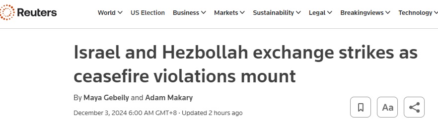以色列突然发动袭击 真主党指责以色列违反停火协议