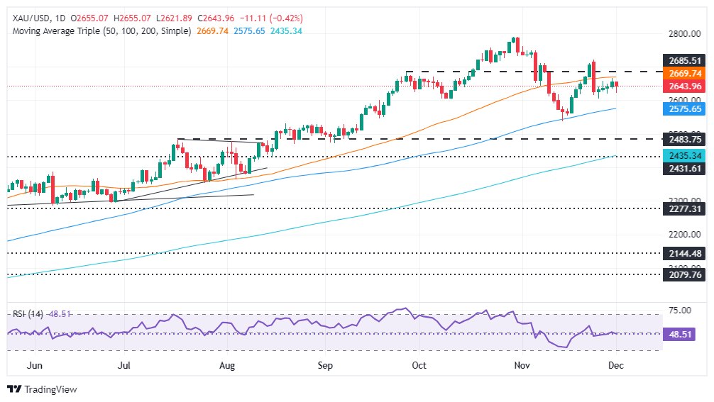 FXStreet分析师Christian Borjon Valencia指出,金价上行趋势保持不变,但买家未能决定性地突破50日简单移动平均线(SMA)2669美元/盎司。正如相对强弱指数(RSI)在50中性线附近徘徊所描绘的那样,金价可能还会出现进一步的盘整。