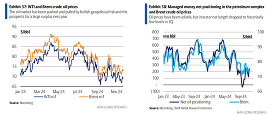 在需求端,全球经济增长放缓、新兴市场复苏乏力以及美元走强都对石油需求形成抑制。美银美林预计,2025年全球石油需求增长仅为110万桶/日,与非OPEC的供应增量相差甚远。尽管中东地缘政治紧张局势可能在短期内支撑油价,但这一影响难以抵消供需基本面带来的压力。