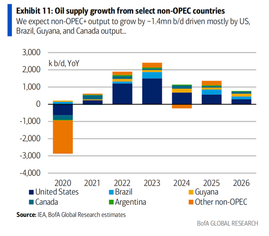 此外,巴西的盐下油田项目将在2024至2026年间集中投产,包括Mero 3、Buzios 7等多个大型FPSO(浮式生产储卸装置),预计将为巴西贡献约30万桶/日的新增供应。圭亚那的Yellowtail项目预计将在2025年下半年投产,为该国新增产能12万桶/日。