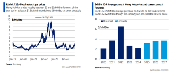 与原油市场的疲软形成对比的是,天然气市场或将成为2025年的亮点。美银表示,特朗普未来的潜在政策可能包括恢复天然气出⼝许可轮次,并且联邦能源管理委员会已经批准了大量液化天然气出口设施。