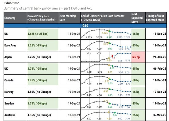大摩认为,为了应对各自经济状况,2025年全球货币政策将变得更加复杂。货币政策的分化表现为欧洲央行的降息幅度超过美联储,而日本央行则继续加息。