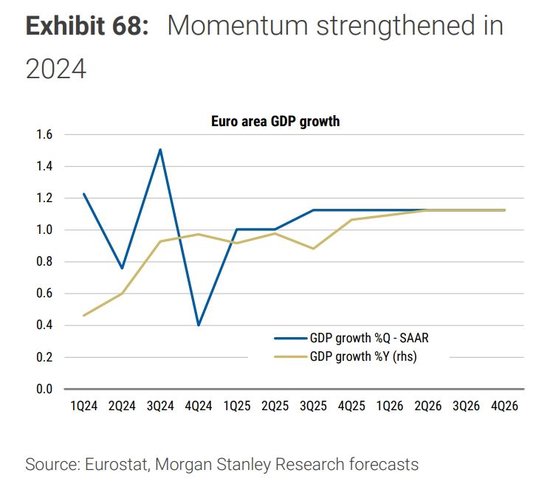 大摩认为,欧元区经济增长缓慢,部分原因是货币政策紧缩以及通胀冲击后实际工资恢复极为缓慢。展望未来,通胀应会持续下降,减轻实际收入的拖累,但美国关税将影响通胀进一步下降。