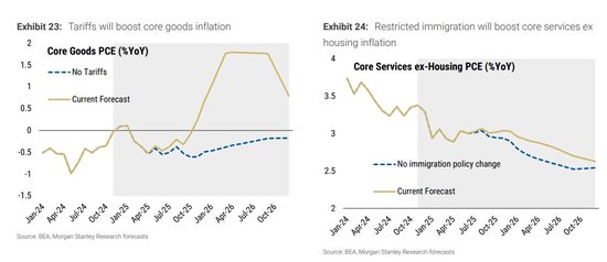 大摩认为,关税及限制性移民政策将导致美国劳动力市场收紧,推动核心通胀在2025年中期触底后,于2025年四季度和2026年一季度上升。核心通胀将从2026年上半年的2.7%降至2026年四季度的2.4%,始终高于目标水平。