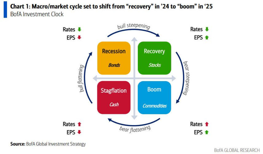 美银投资时钟表明,2024年股市看涨的“复苏”阶段(利率下降和每股收益上升)可能会在2025年被商品看涨的“繁荣”阶段(每股收益上升和利率上升)所取代;第一季度收益率曲线的“熊市陡峭化”将预示这一转变,债券开始反映“通胀繁荣”并不再反映“利率下调”;