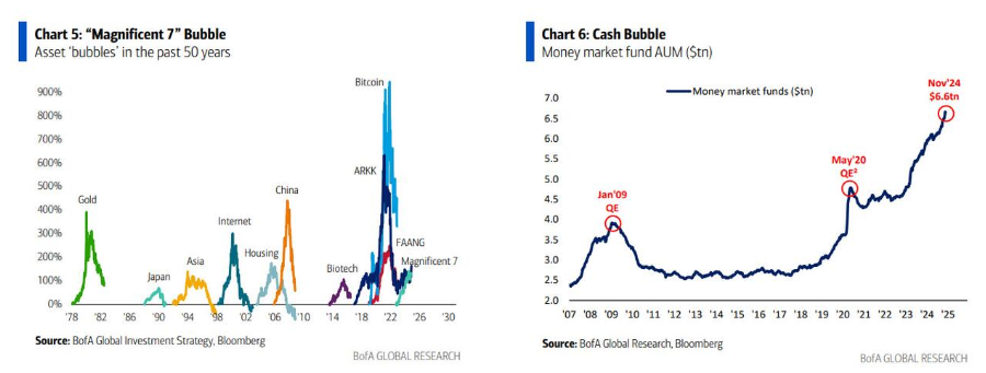 我们认为AI/七巨头的泡沫是最明显的“尾部风险”,因为许多投资者预期7万亿美元的货币市场基金将最终投入美国股市(如果第一季度更紧的金融条件未能抑制投资者的动物精神,那就真的像1999年了)。我们认为,在七大科技巨头泡沫中,做多加密货币和中国股票(低估值/科技相关)是最佳选择。