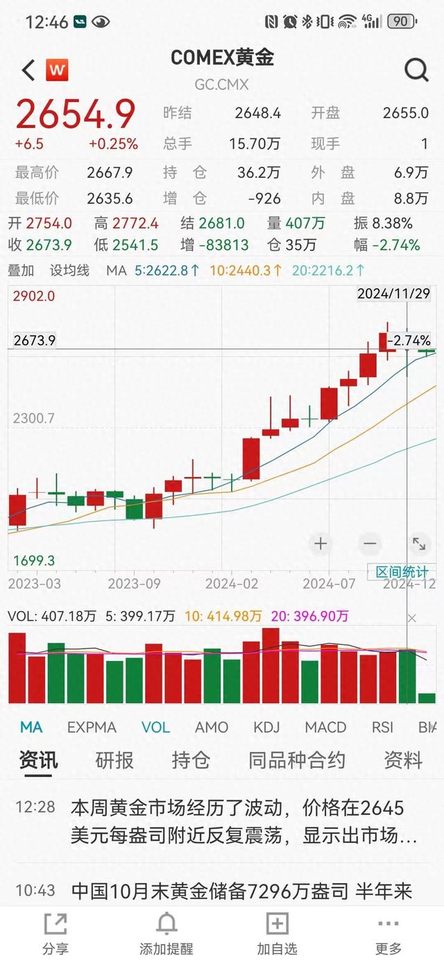 财联社记者注意到,随着特朗普胜选之后,国际金价从历史新高后一路向下,但近期有所回升。12月7日凌晨,COMEX黄金期货报2654.9美元/盎司,微涨0.25%。