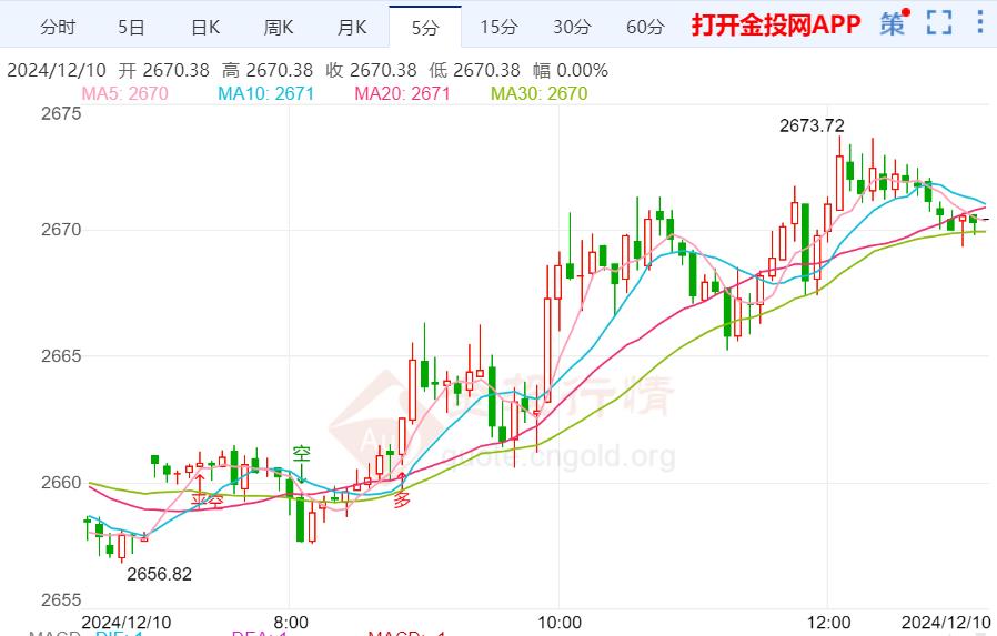周二(12月10日)本交易日现货黄金日内维持震荡走势,今日开盘报2661.06美元/盎司,最高触及2673.72美元/盎司,最低触及2657.59美元/盎司,截止发稿金价报2669.41美元/盎司,涨幅0.36%。金价周一触及两周高点2676.31美元/盎司,攀升逾1%,收报2660.09美元/盎司。主要原因是亚洲大国央行在中断六个月后重新开始购买黄金,这一动态引发了市场的广泛关注。市场对其他央行效仿的期待进一步增强了黄金的投资吸引力。