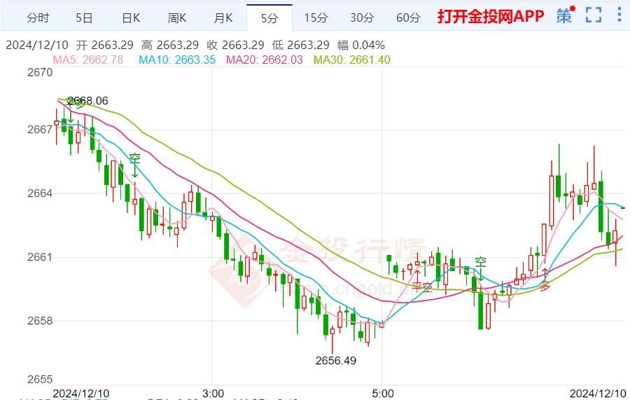 周二(12月10日)本交易日现货黄金日内维持震荡走势,今日开盘报2661.06美元/盎司,最高触及2666.34美元/盎司,最低触及2657.59美元/盎司,截止发稿金价报2663.21美元/盎司,涨幅0.12%。主要受到中国央行在暂停6个月后重新购买黄金的推动,加之市场对美联储下周降息的预期显著增强,进一步提振看涨情绪,黄金价格周一(12月9日)创下两周新高,涨幅超过1%。