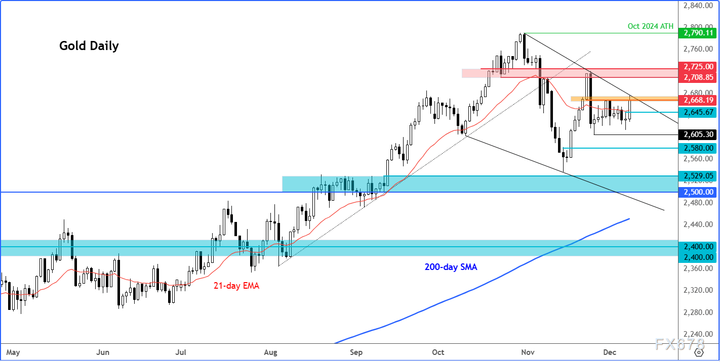 下一个支撑位在2580美元:这是11月中旬上一次反弹开始的区域。如果跌破该水平,那么这可能会为2500- 2530美元铺平道路,2440- 2400美元附近的长期支撑位与200日移动均线一致。