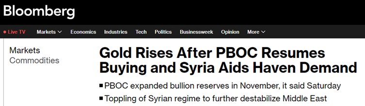 彭博社指出,中国央行7个月来首次增加黄金储备,而叙利亚政府的迅速垮台进一步破坏中东的稳定,这两大因素刺激金价周一上涨。