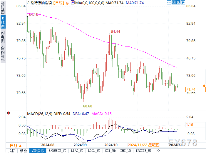 布伦特原油目前报71.77美元/桶,日内小幅下跌0.13%;美原油报67.98美元/桶,下跌0.59%。尽管周一原油市场曾因中国政策刺激预期上涨,但周二价格回落反映出市场对叙利亚局势影响有限。尽管叙利亚本身不是主要产油国,但其地缘位置及与俄罗斯和伊朗的联系,使市场对区域局势扩大的风险保持警惕。然而,分析师指出,“中东紧张局势似乎得到了控制,这降低了油价因区域冲突扩大而大幅波动的可能性。”