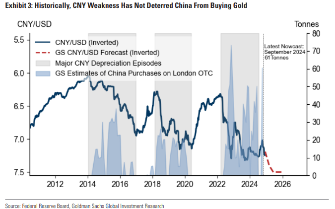 高盛观察到,中国作为2022年以来最大的黄金买家,在人民币走弱期间,包括2014-2016年、2018-2020年和2022年至今,系统地在伦敦场外市场购买黄金。最新公布的外储数据显示,在暂停六个月后,中国央行于11月再次购买黄金。