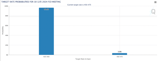 美国11月CPI数据符合预期,数据公布后,交易员加大了对美联储12月降息的押注。芝商所Fed Watch工具显示,市场押注12月降息的可能性由数据发布前的86.1%增至96.4%。市场同时继续预期,美联储明年1月将不会降息,不过CPI出炉后,1月降息的几率也小幅上行,达到约23%。