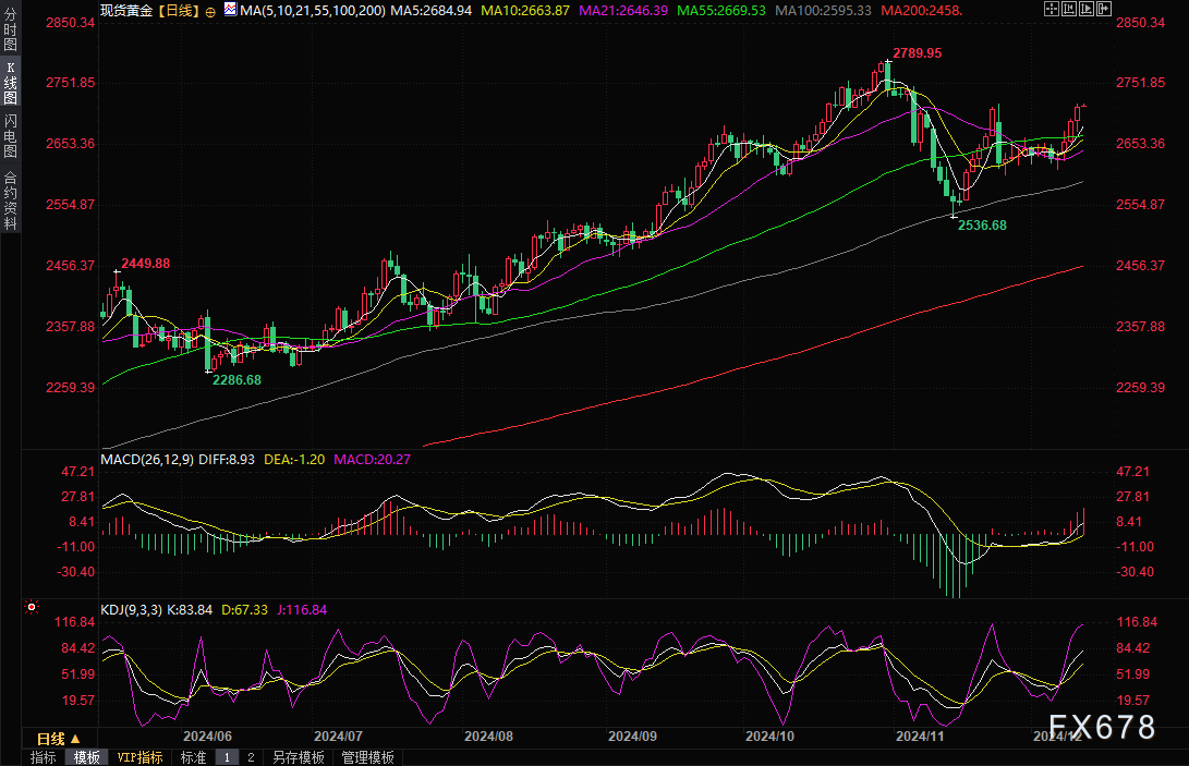 周四(12月12日)亚市早盘,金价高位震荡,现货黄金目前交投于2719.22美元/盎司发附近。金价周三上涨逾20美元,为连续第四个交易日上涨,盘中最高曾触及2720.98美元/盎司,仅略低于11月25日创下的一个月高点2721.21美元/盎司;此前公布的通胀数据符合预期,提高了美联储下周降息的可能性,同时投资者等待美国生产者价格指数(PPI)数据为货币政策提供进一步方向。