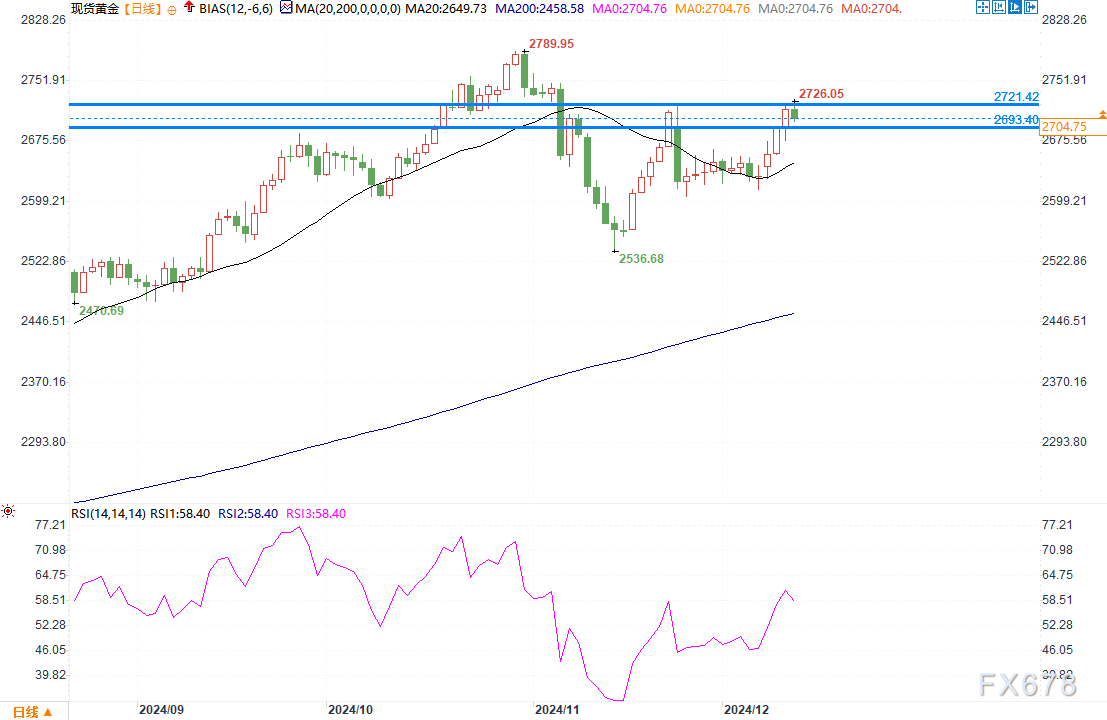 12月12日周四,金价小幅下跌,未能有效收复关键阻力位2721.42美元。目前,金价受到2693.40美元水平的支撑,随后是2671.22美元和2663.51美元支撑。上涨空间依然存在,历史高点2790.17美元是潜在目标,但需要强力买盘推动才有望达成。