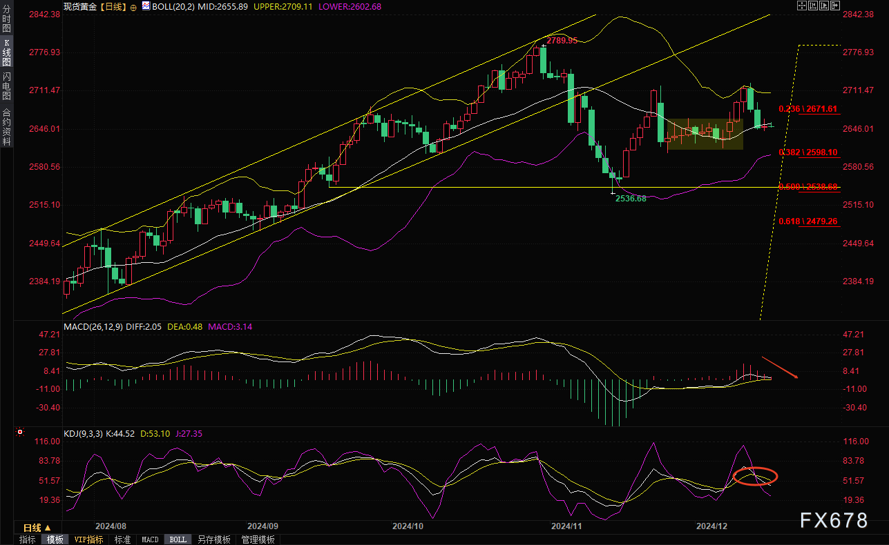 4小时级别:倒V反转后震荡;KDJ金叉,MACD死叉但红色柱萎缩,短线走势变数较大,鉴于布林线开口向下发散,在顶破布林线中轨2671.37前,后市仍偏向震荡下行,如果跌破周一低点2643.41附近支撑,可能会进一步下探布林线下轨2627.29附近支撑。