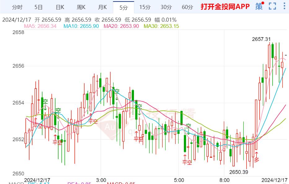 周二(12月17日)亚市早盘,现货黄金窄幅震荡,目前交投于2656.81美元/盎司附近。金价周一探底回升,盘初曾跌创一周新低至2643.41美元/盎司,收报2652.50美元/盎司附近,受持续的地缘政治担忧和美元走软的支撑,不过,市场在等待美联储的政策会议,观望情绪较浓,整体交投比较谨慎;预计美联储将第三次降息,并提供有关2025年前景的线索。
