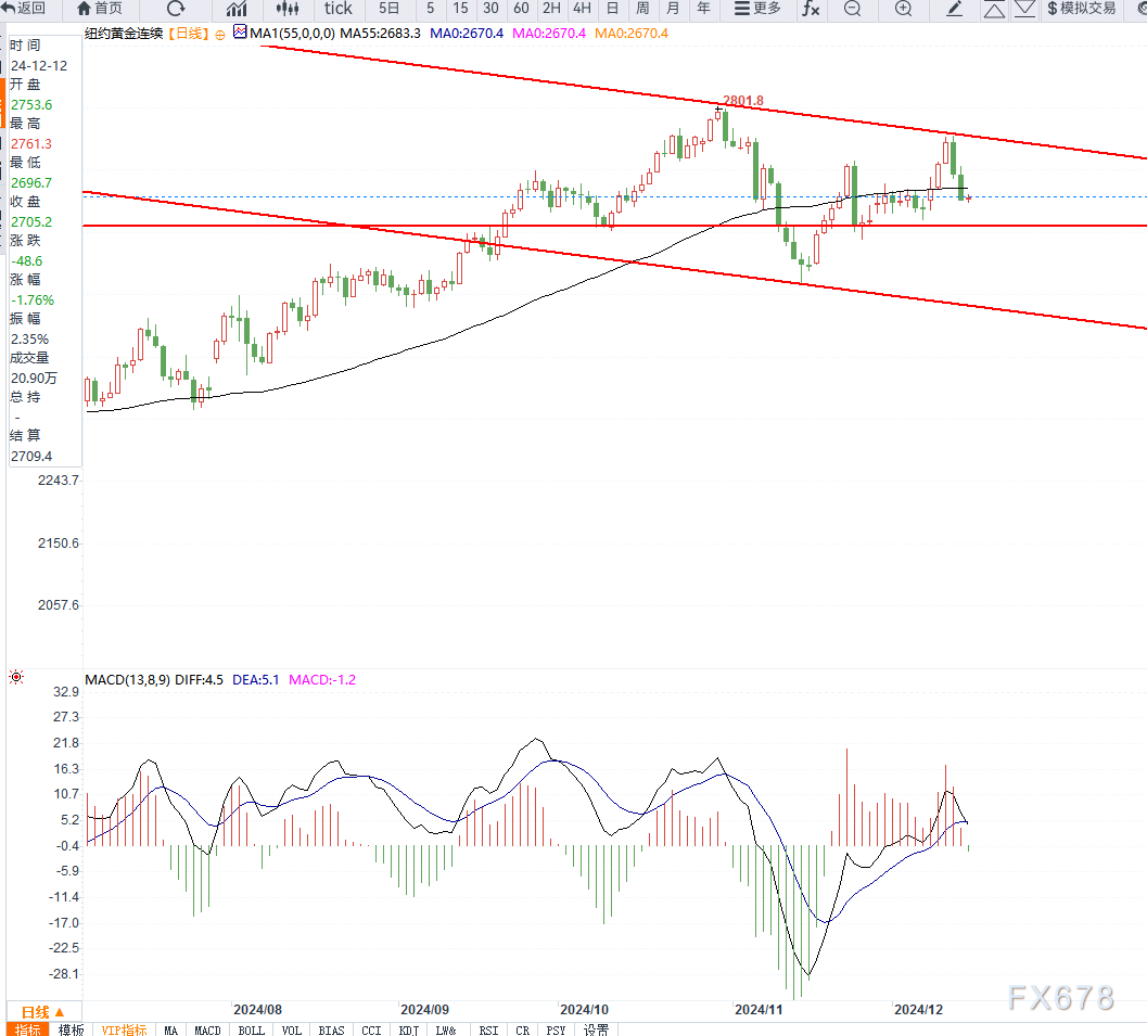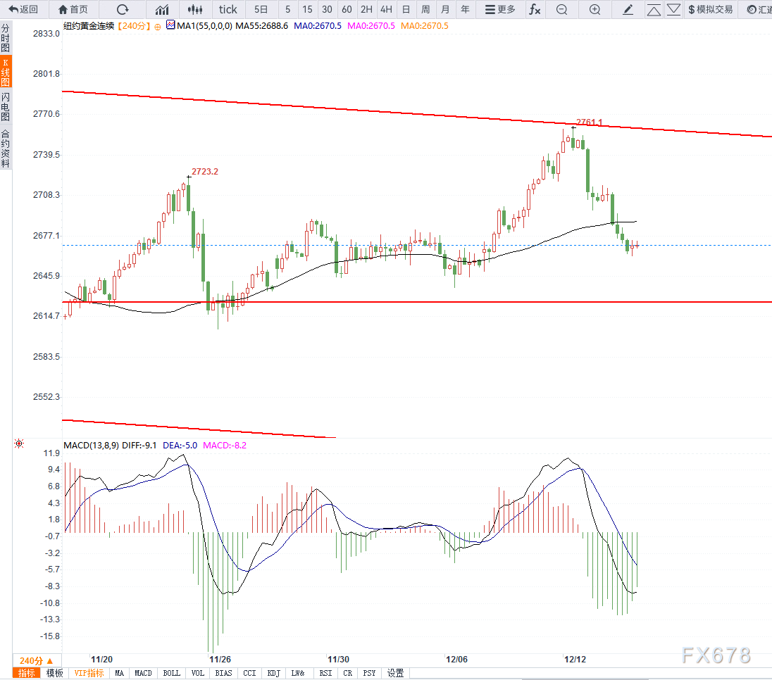 日内均线已经破位,且MACD二次死叉,反抽2685美元无法站稳,则维持震荡调整,下方跌破2630美元则加速下行。