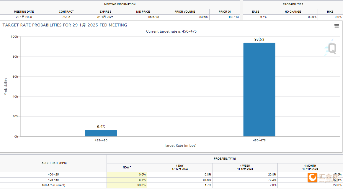 联邦基金利率期货市场认为,隔夜指标利率将在美联储 1 月份的政策会议上保持不变,1月份进一步降息概率仅6.4%。较高的利率预期降低了持有非孳息资产的吸引力。