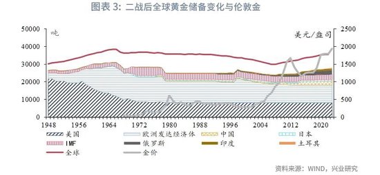 二战后至布雷顿森林体系解体这段时期,全球央行黄金储备先升后降,金价看似平稳但实则内生上涨动能充足。