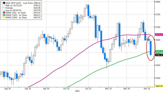 美元和美债收益率携手走高,拖累金价周三跌逾2%,现货金最深跌至2590美元下方至一个月最低: