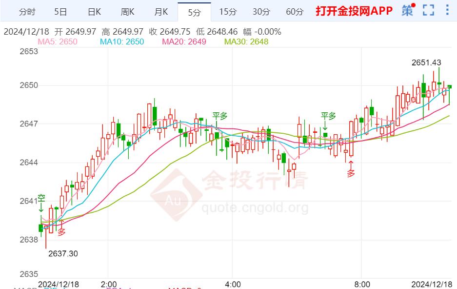 周三(12月18日)本交易日现货黄金日内维持震荡走势,今日开盘报2645.95美元/盎司,最高触及2651.43美元/盎司,最低触及2643.99美元/盎司,截止发稿金价报2650.36美元/盎司,涨幅0.18%。
