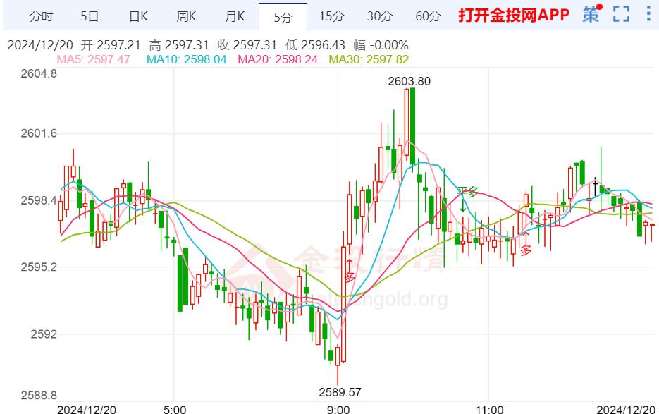 周五(12月20日)本交易日现货黄金日内维持震荡走势,今日开盘报2595.75美元/盎司,最高触及2603.89美元/盎司,最低触及2589.57美元/盎司,截止发稿金价报2596.78美元/盎司,涨幅0.13%。在美联储发布最新声明后,黄金的抛售压力持续。