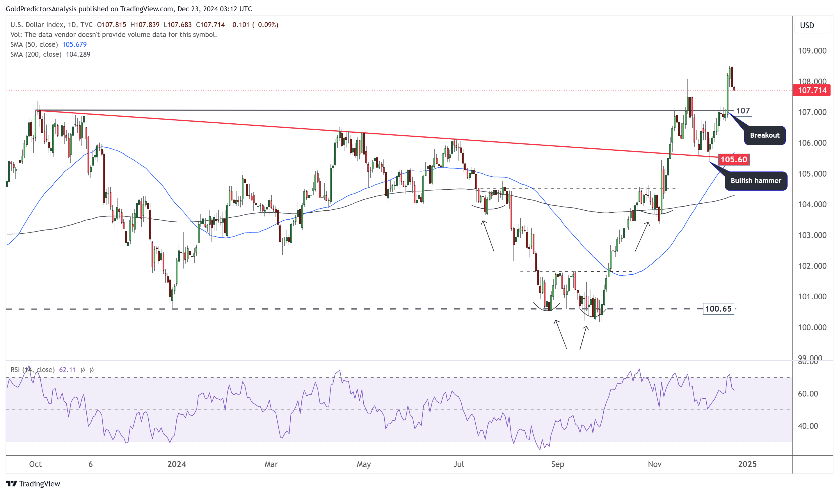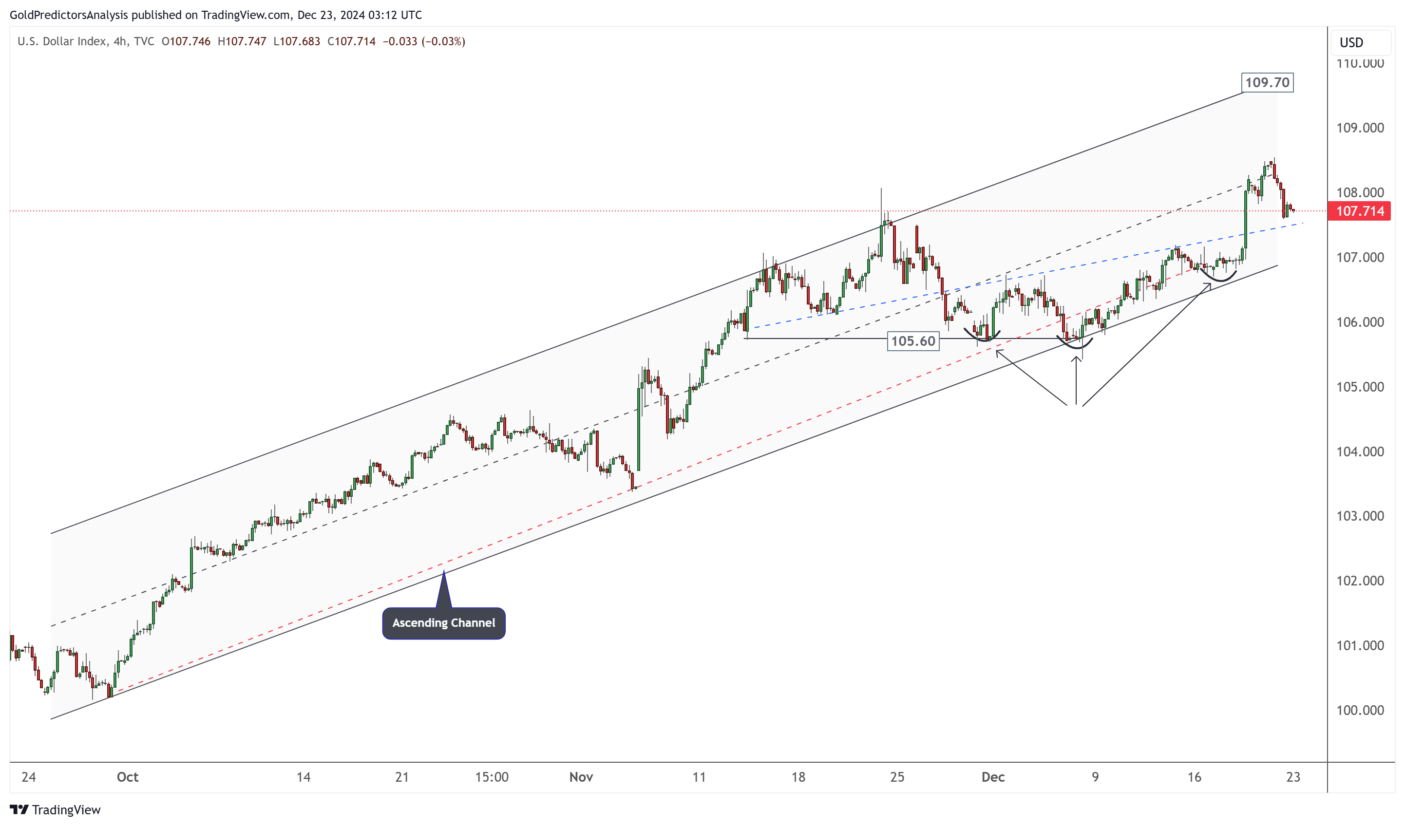 美元指数日线图显示,在美联储12月降息后,美元指数突破了关键水平107。然而,核心PCE数据促使美元指数回调至突破水平。从技术面来看,该指数已突破关键水平并保持上行趋势。日线图上的双底和倒头肩形态进一步支撑了看涨趋势。105.60和107水平是关键支撑区域。