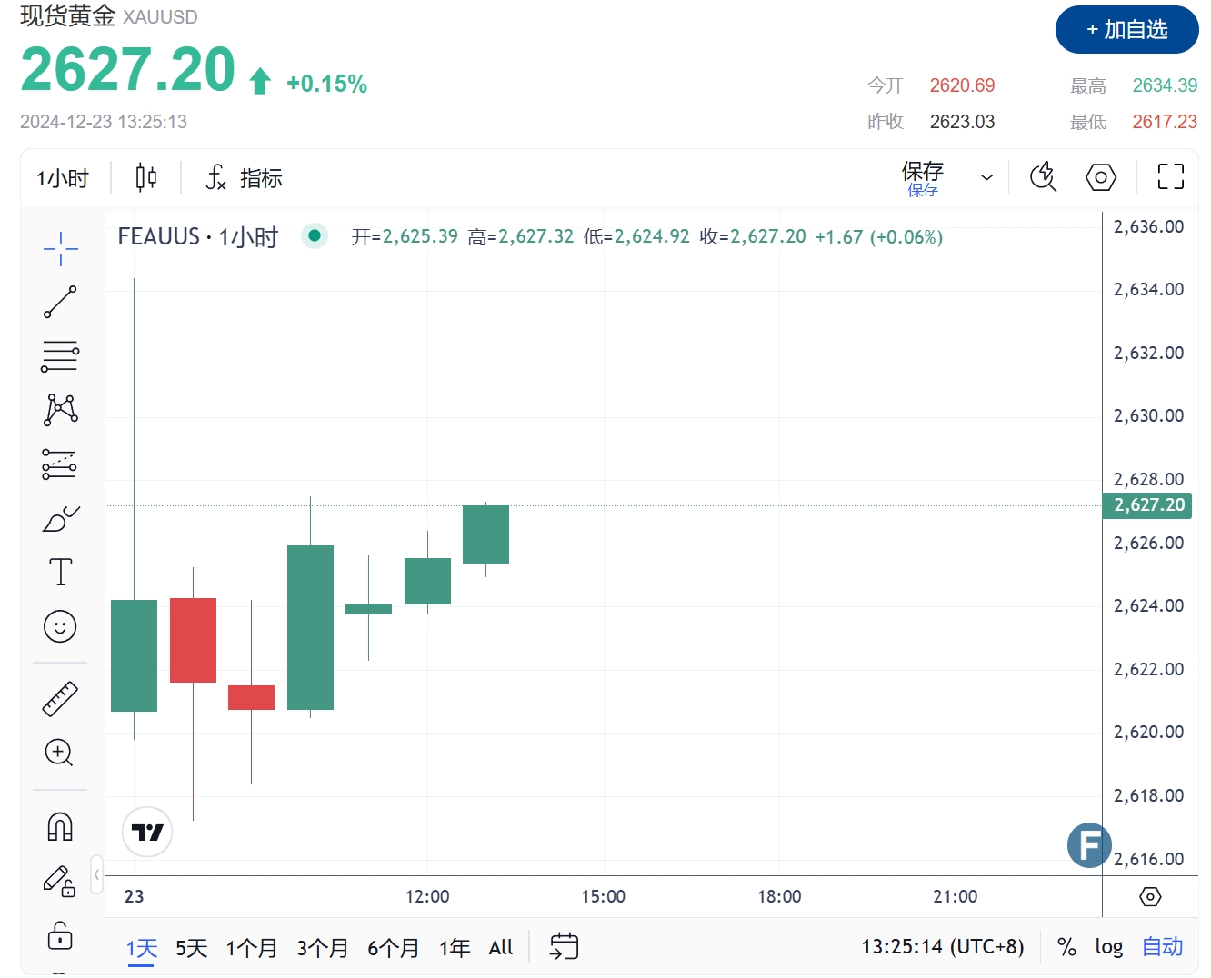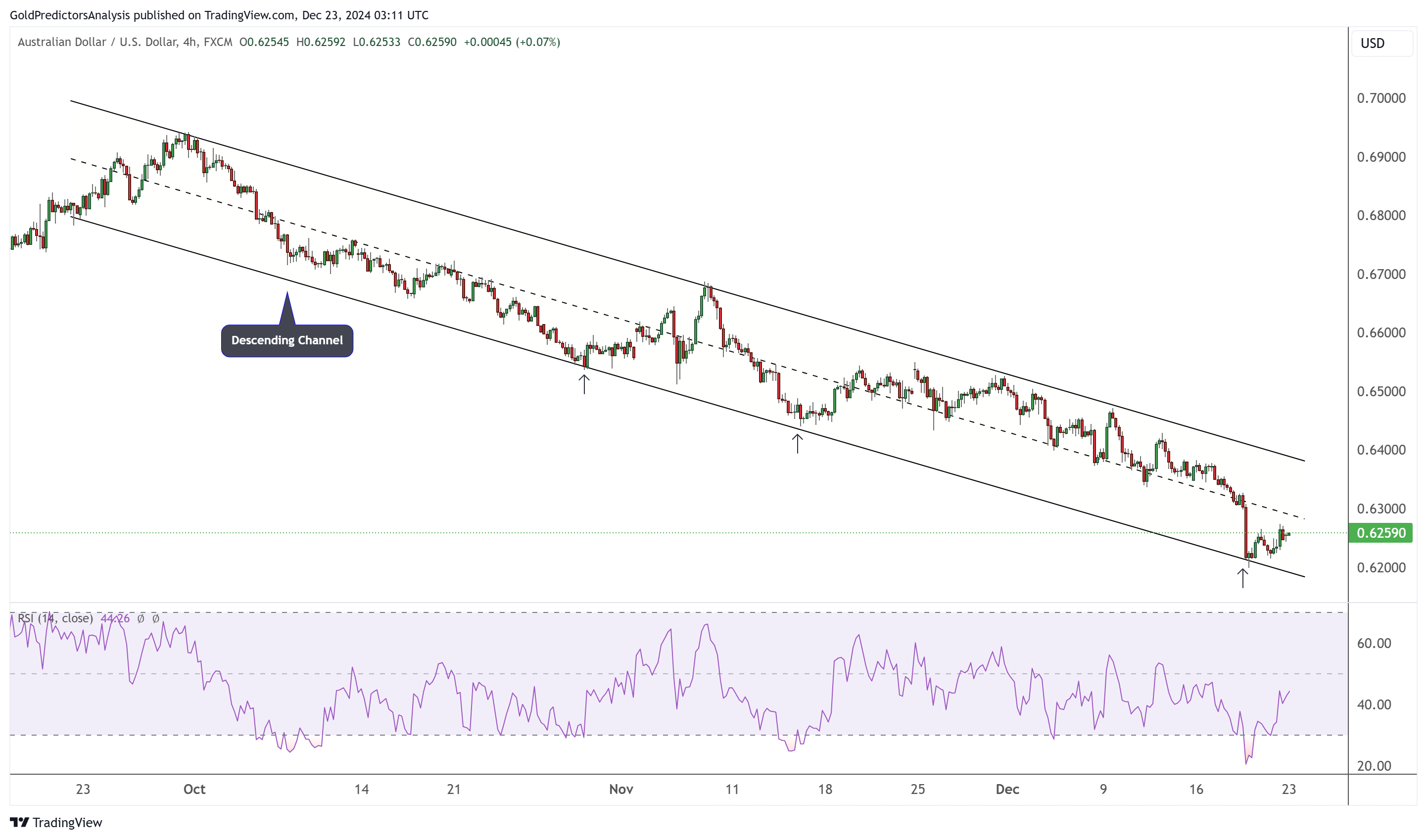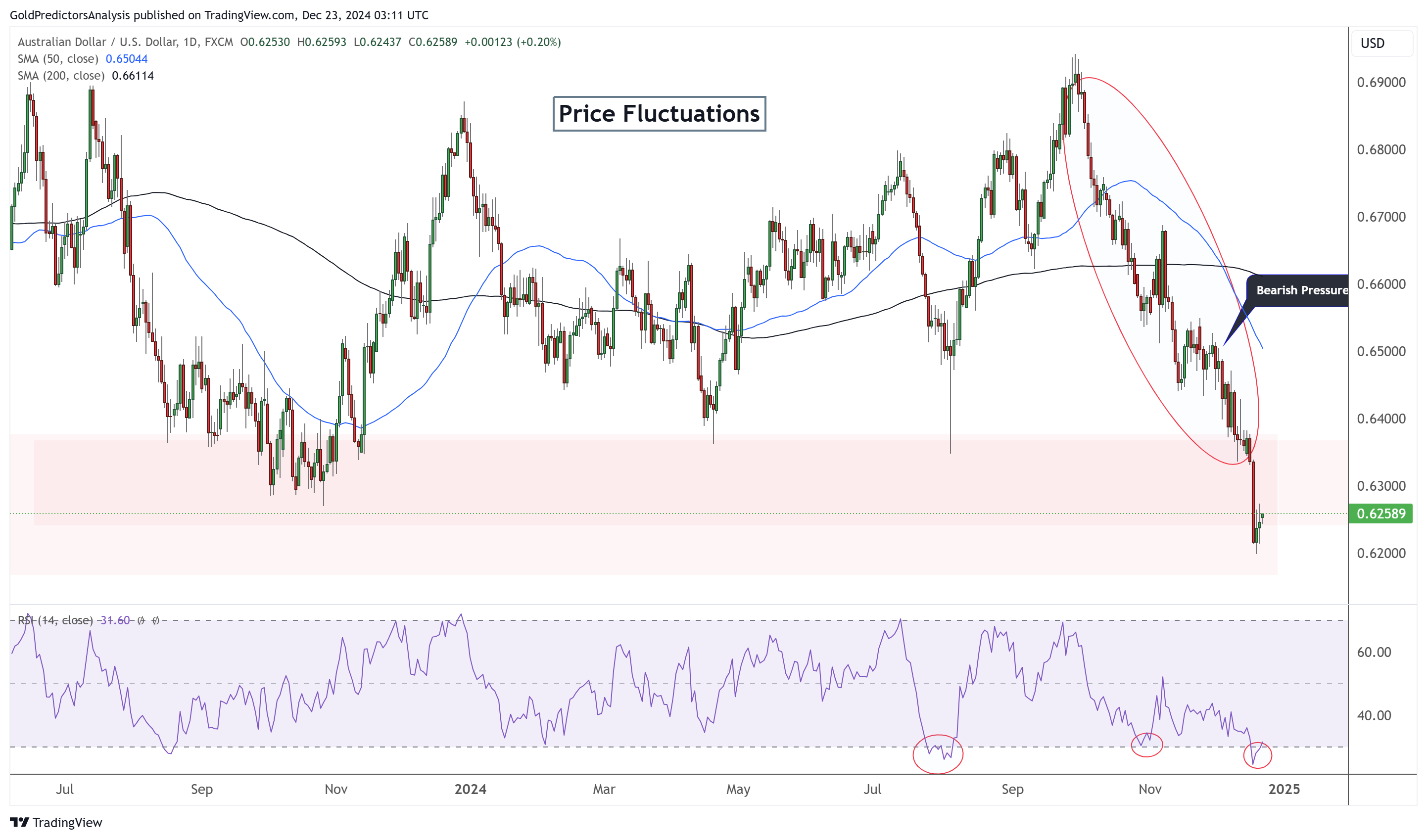 24K99讯 周一(12月23日),黄金价格微幅反弹至2627美元,美国PCE数据意外低于预期,核心通胀率未低到足以阻止美联储在2025年1月暂停降息,提振了“鸽派”定价回归。美元指数出现下行修正,澳元/美元仍面临看跌压力,但接近长期支撑区域。