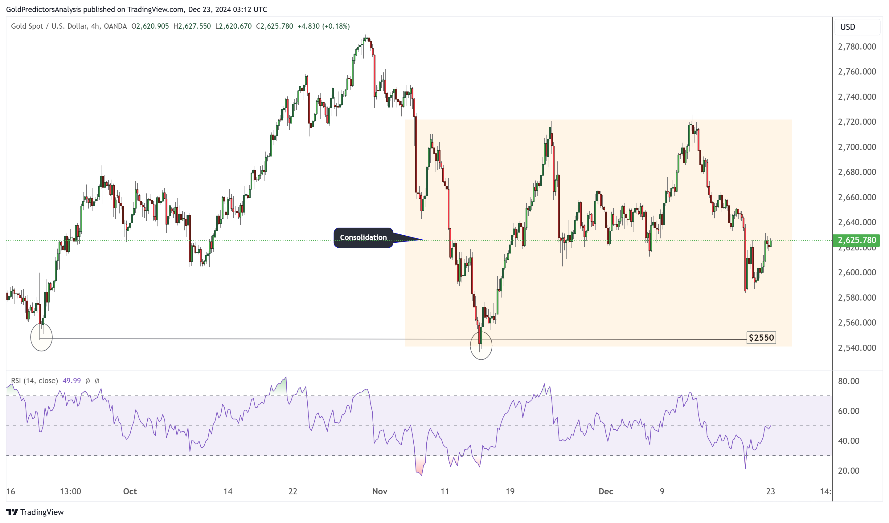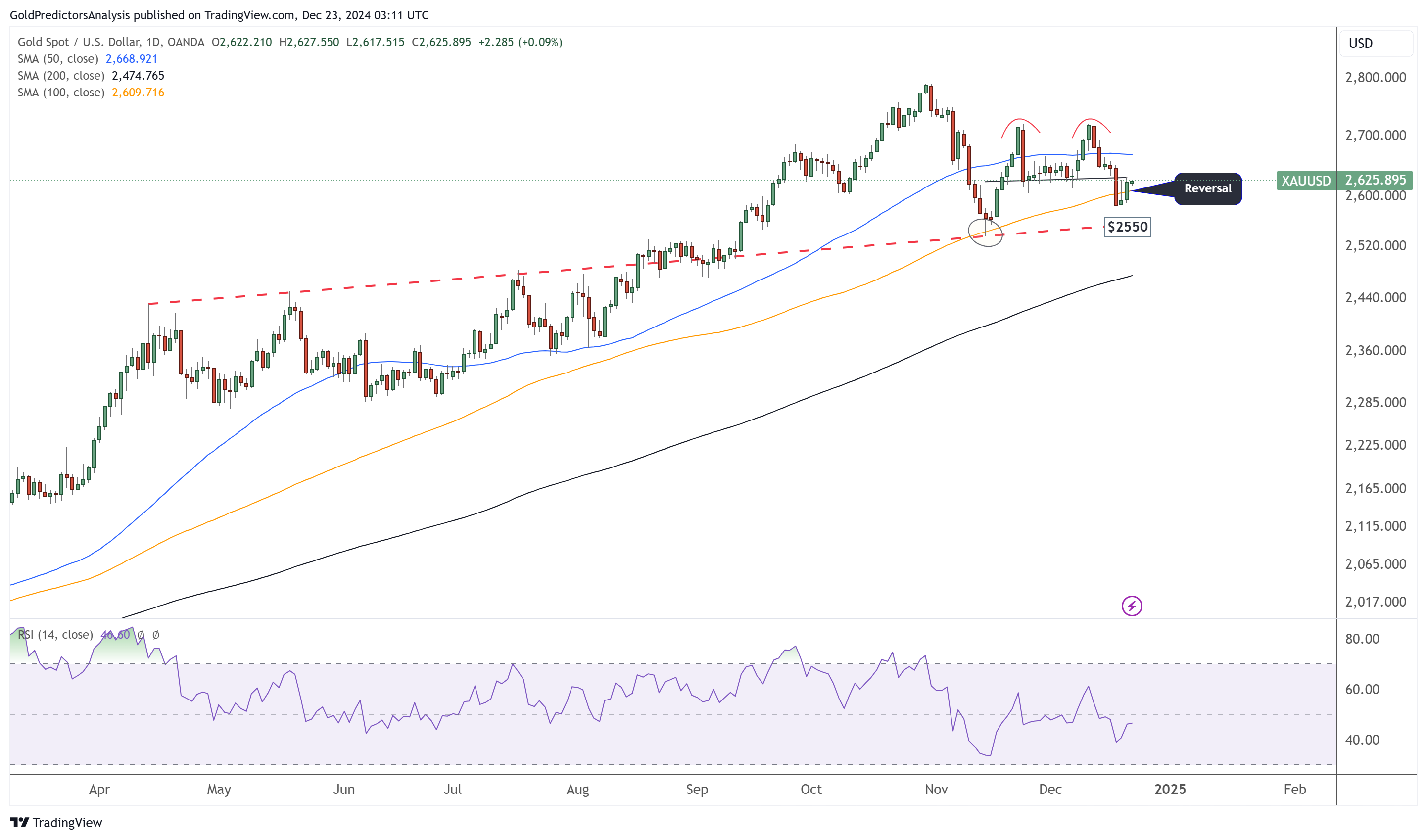 黄金日线图显示,12月金价在宽幅区间内盘整。尽管盘整,但市场仍看涨,因为价格在红点趋势线上方交易。周五美国PCE数据公布后,金价收于100日均线上方,强化了看涨趋势。