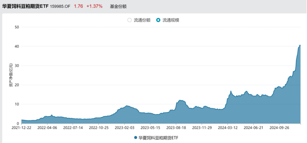 Wind数据显示,截至12月20日,华夏饲料豆粕期货ETF的规模已站上40亿关口,为40.37亿元,上周,该ETF规模一度创新高至40.62亿元。此前,在11月底,该ETF的规模仅为27.24亿元,12月期间,规模增长了13.38亿元,增幅达到49.12%。