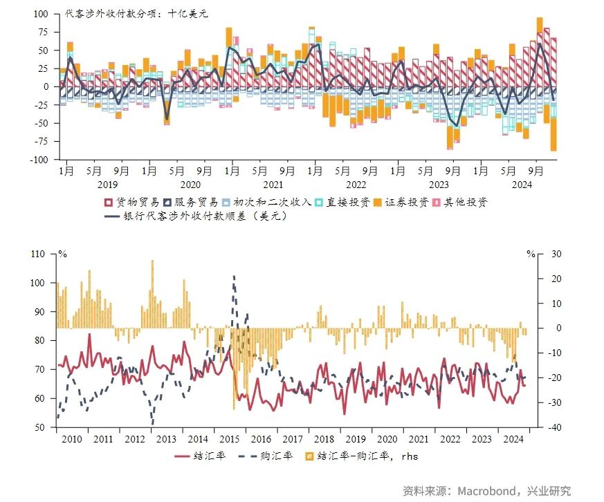 2024年11月,银行代客结售汇录得顺差41亿美元,前值为顺差158亿美元,环比顺差缩窄117亿美元;银行远期代客净结汇顺差39亿美元,前值顺差76亿美元,环比顺差缩窄37亿美元;银行代客涉外收付款逆差195亿美元,前值顺差328亿美元,环比逆差扩大523亿美元。